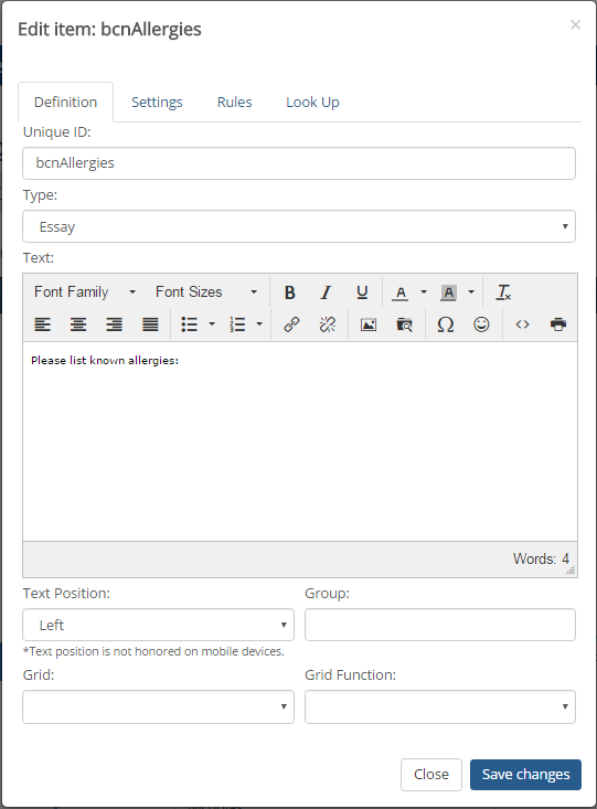 Use the Text Position to determine if the text will appear to the top, right, or left of the question/field. |